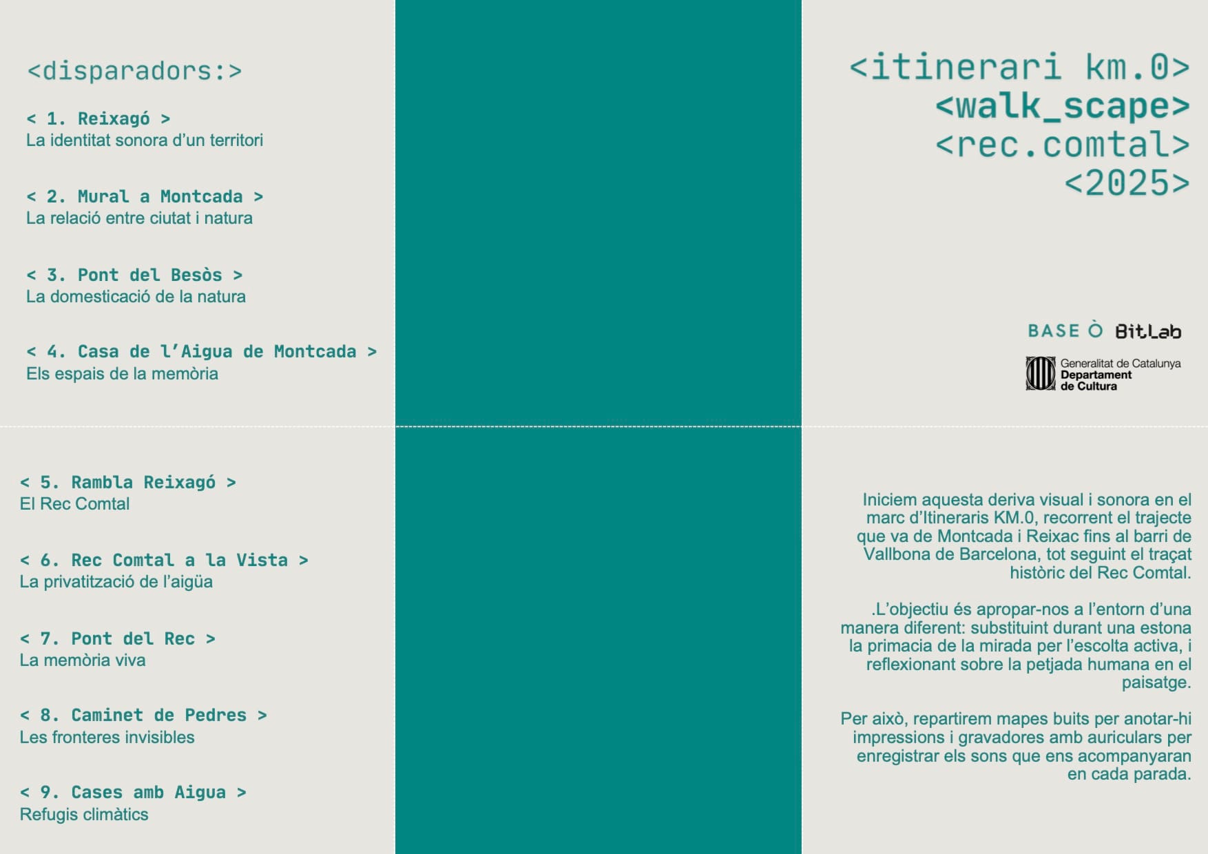 El curs 2024-2025 vam treballar amb l’Escola Ramon Llull del barri de Congrès-Indians, i amb la complicitat d’entitats del territori, com l’associació de veïnes i veïns de Trinitat Vella i l’associació de memòria històrica del mateix barri, seguint el recorregut del Rec Comtal, una antiga sèquia medieval que abastia la ciutat. També vam fer sortides amb grups heterogenis, intergeneracionals, per validar els itineraris creats amb l’alumnat d’ESO. Aquest curs 2025-2026 reiniciem amb la continuïtat de la validació dels itineraris amb el veïnat i altres joves del territori.